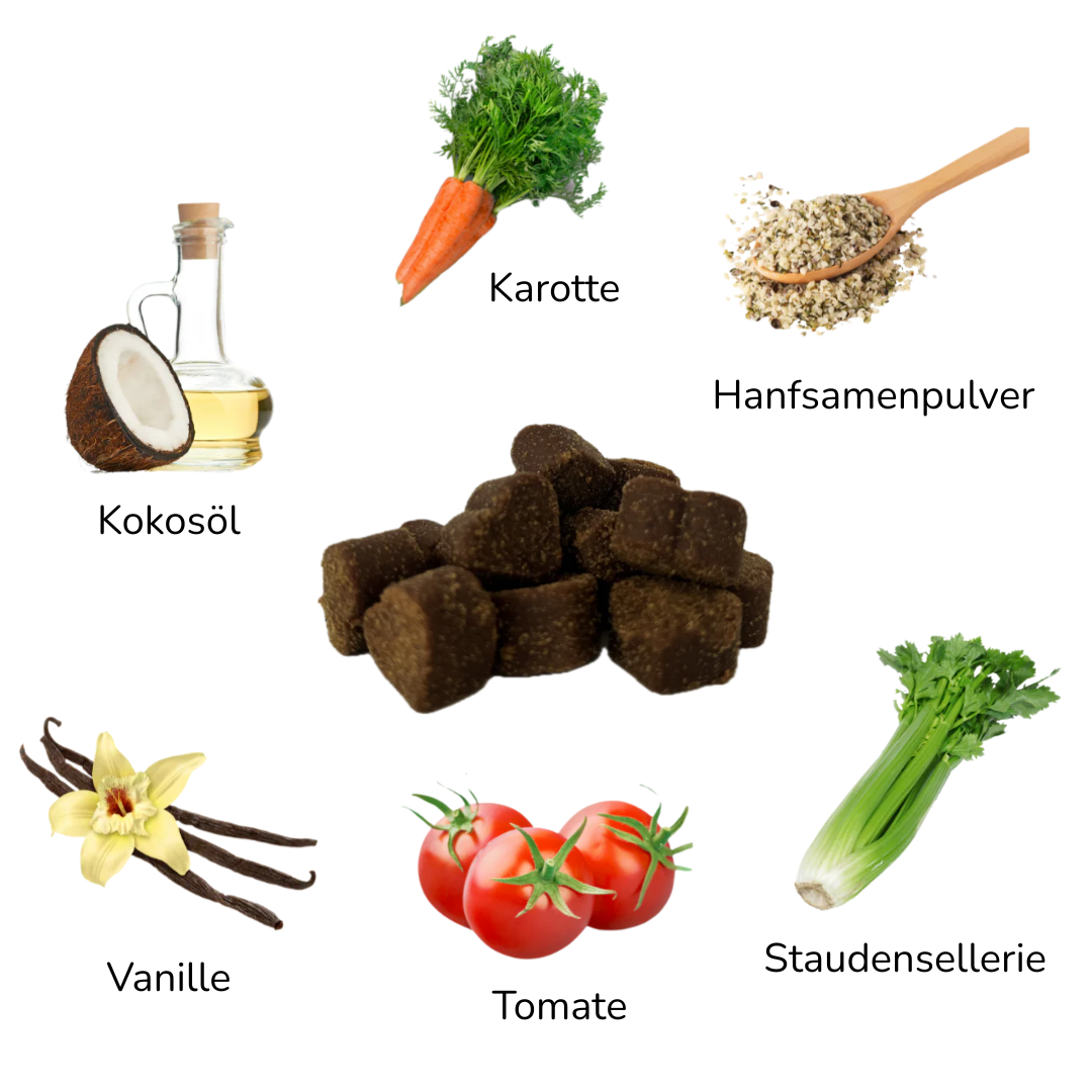 Kokosöl, Knoblauchpulver, Hanfsamenöl, Hanfsamenpulver, Bierhefe, Apfelessig, Vitamin B1, Vitamin B6, Vitamin B12, Leinsamen, Hühnerleberpulver, Rinderknochenmehl, Rübenschnitzel, Tapiokastärke, Vanille, Karotte, Tomate, Kaliumsorbat, Sellerie, Gurke, Zitrusfrüchte, gemischte Tocopherole, Entengeschmack, Sonnenblumenlecithin.